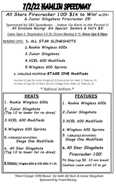Hamlin Speedway OPENING DAY 2025 REGULAR SHOW - All Divisions plus Junior Sprints & 600 Mods Sponsored by: High Bridge House Pappy’s Chad Wheeler Excavating General Admi