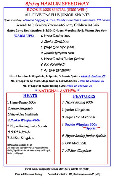 Gates 2pm; Registration 3-5:30; Drivers Meeting 5:45; Warm Ups 6:00pm