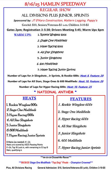 Gates 2pm; Registration 3-5:30; Drivers Meeting 5:45; Warm Ups 6:00pm